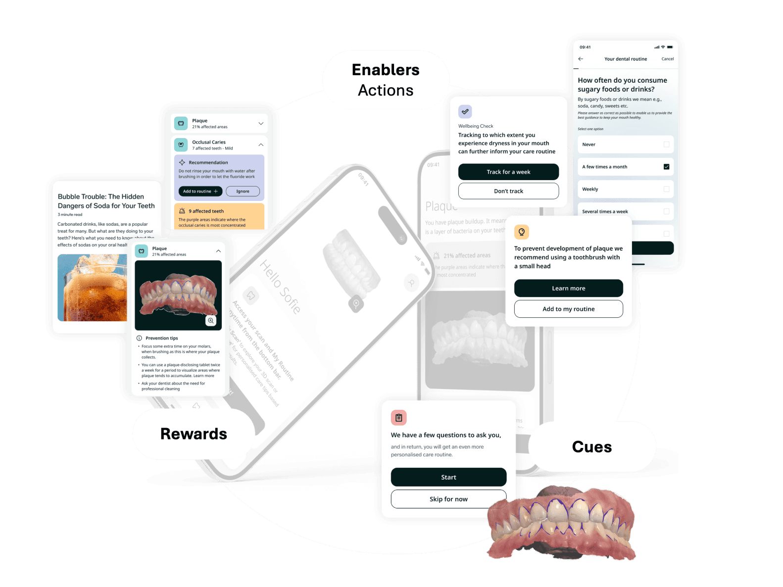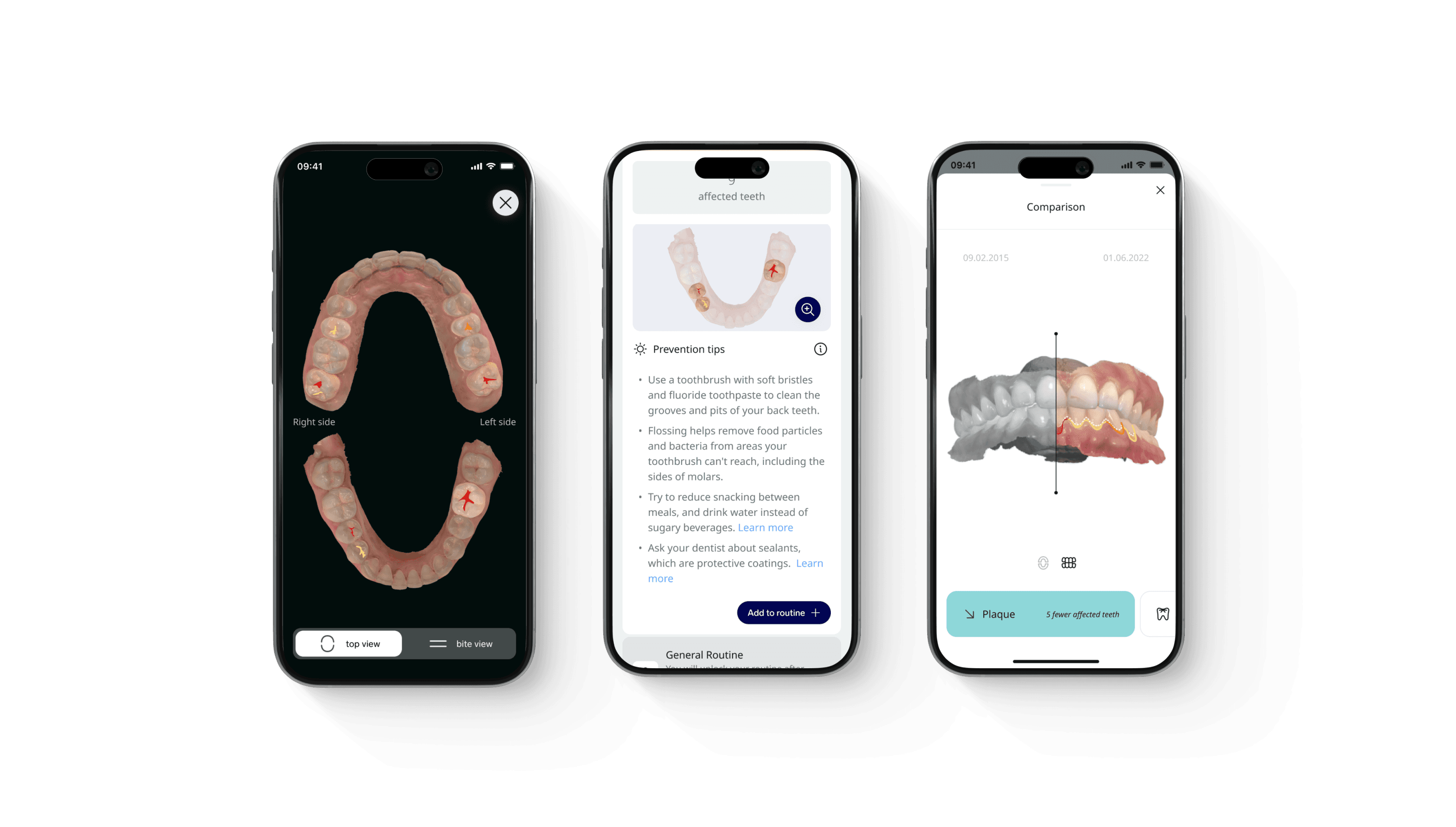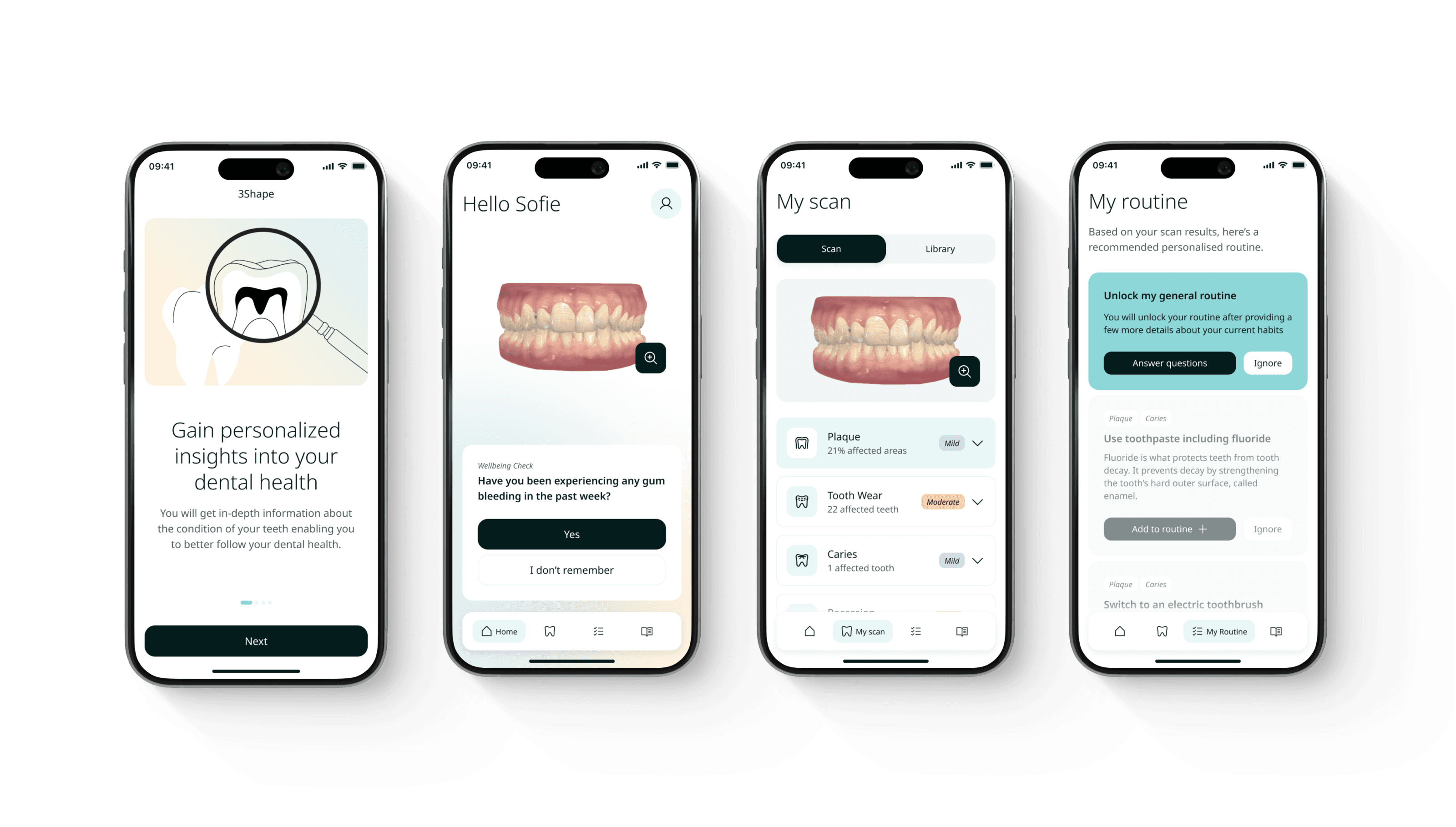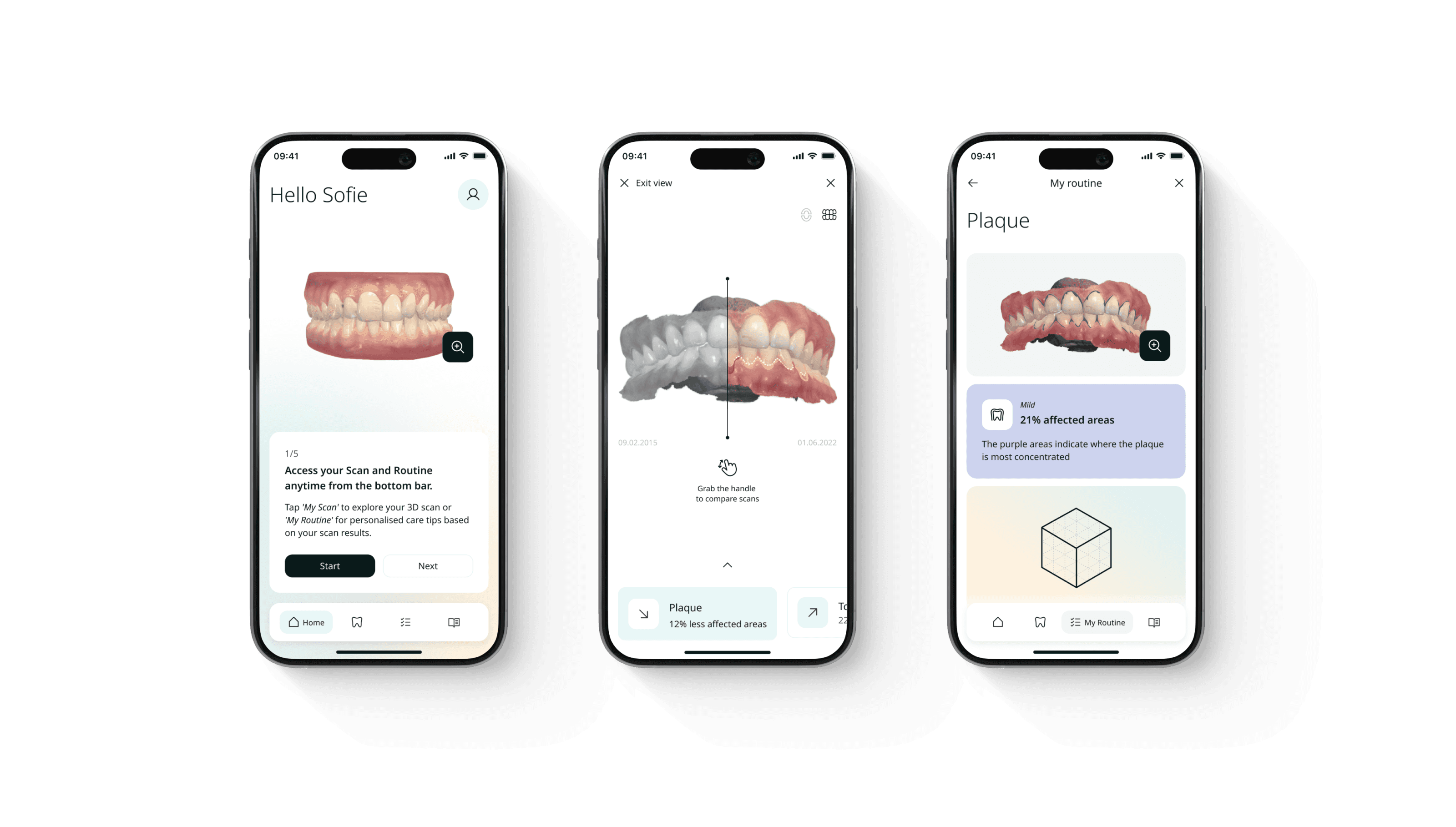 A patient-facing app anchored in our client's 3D scan technology, translating what dentists see in clinical diagnostics into something patients can actually understand and act on.