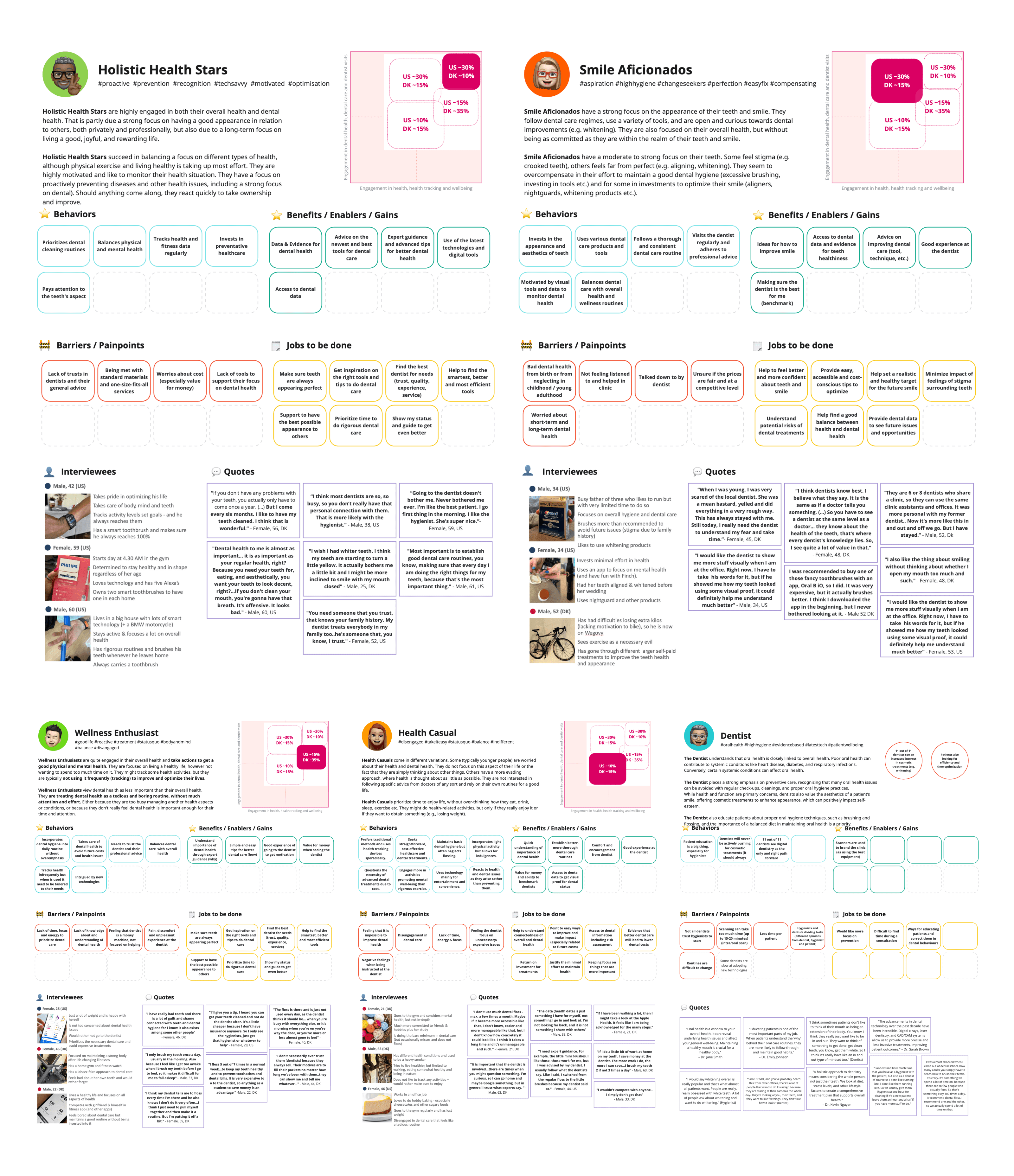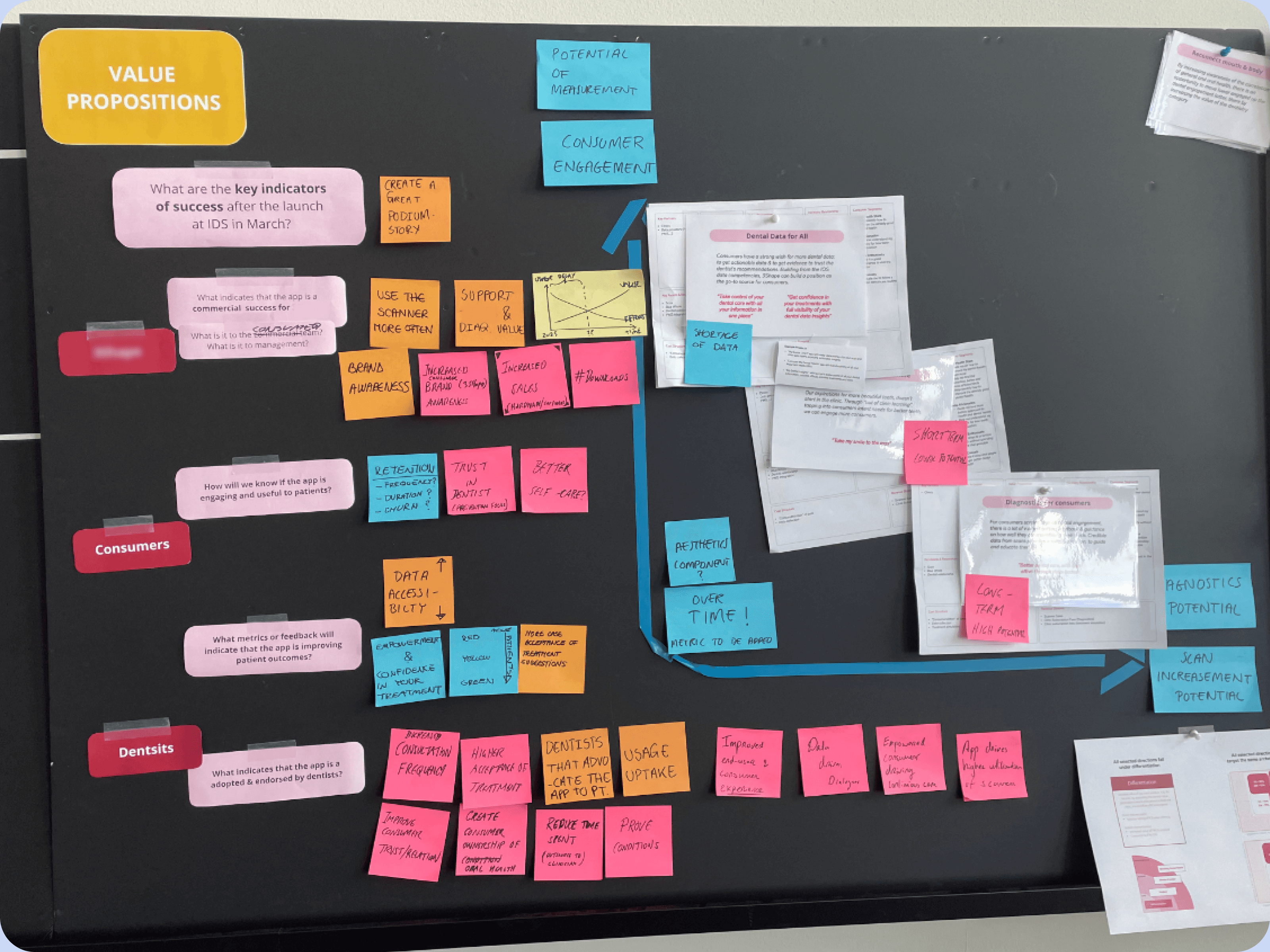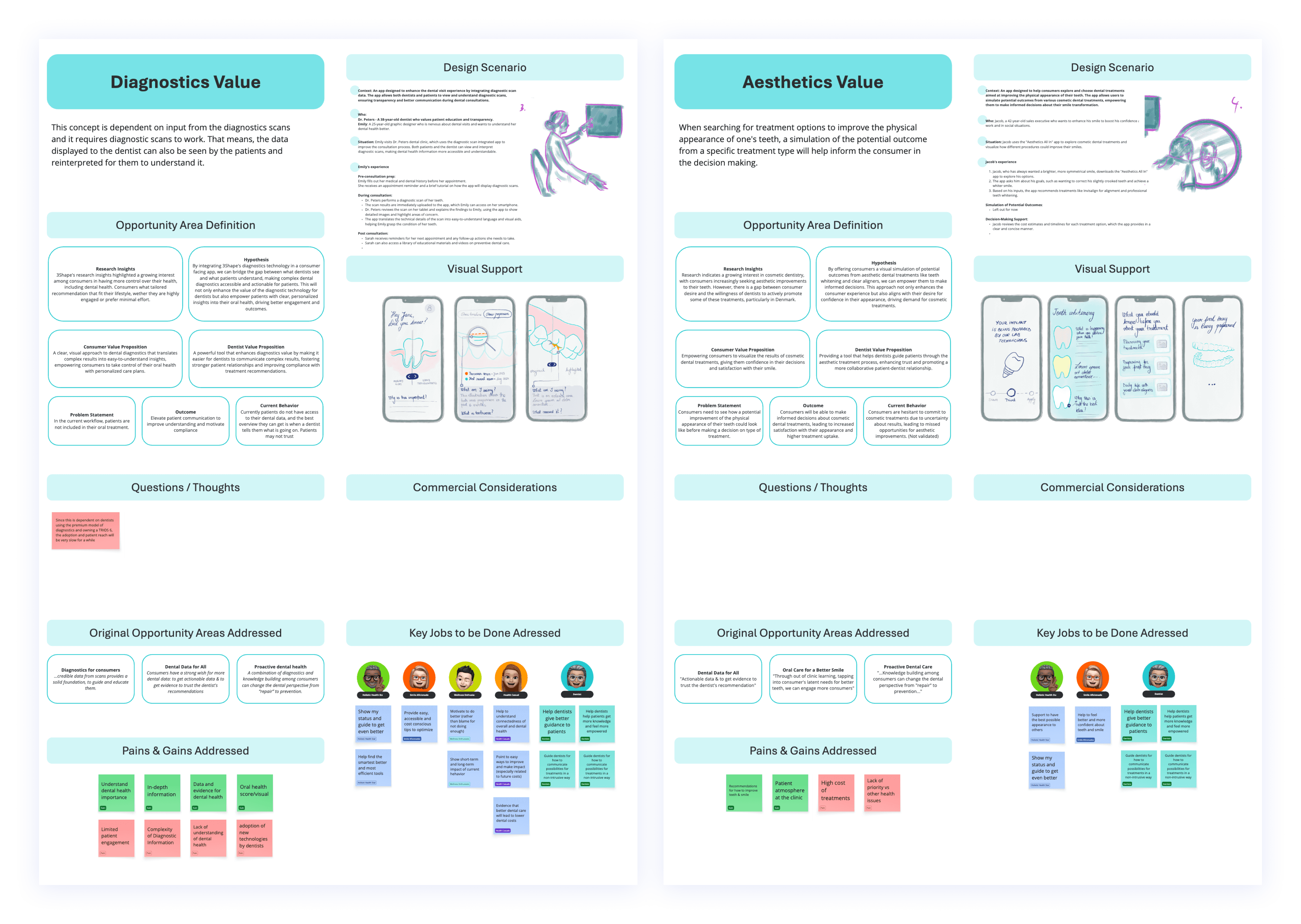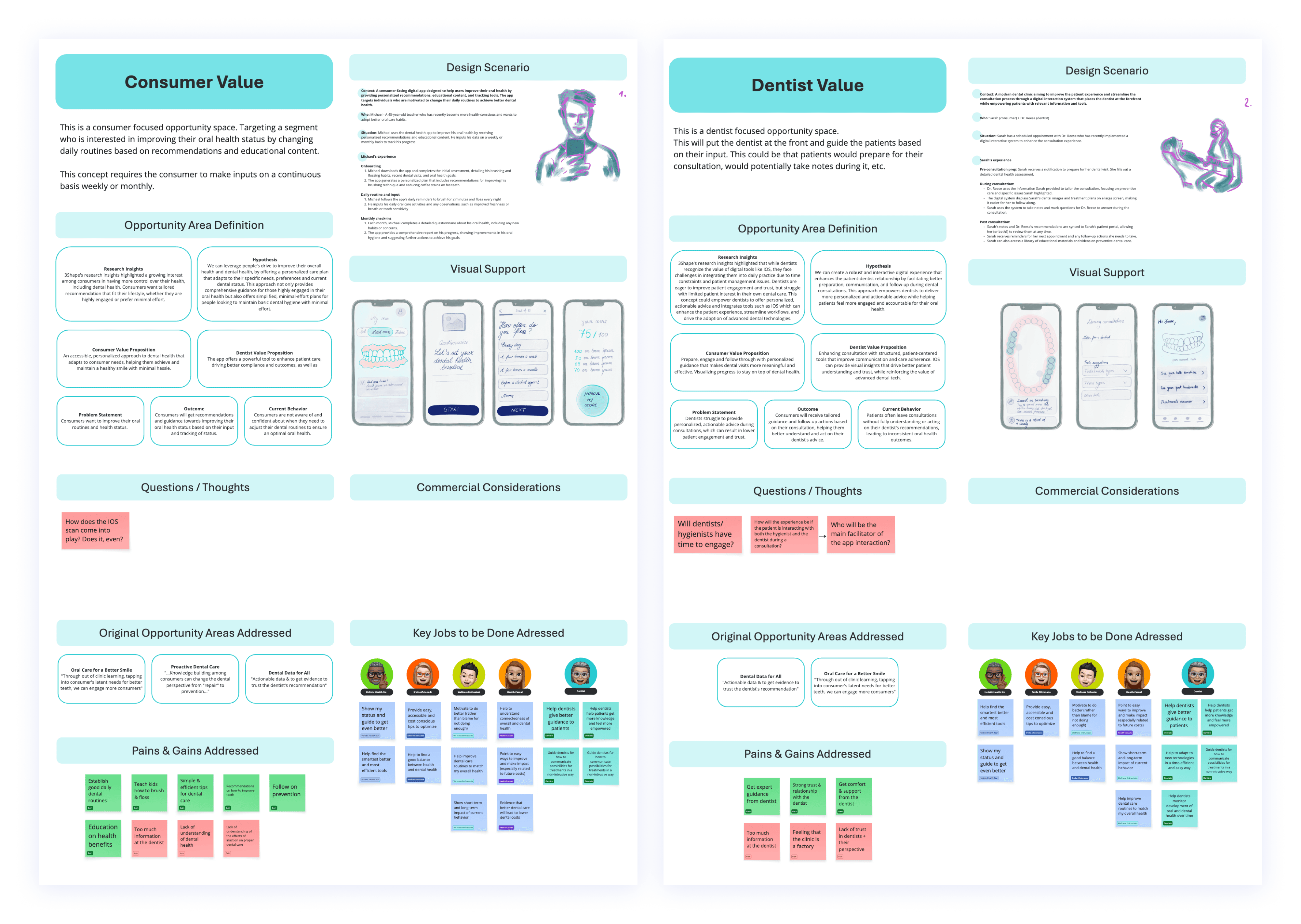 Pre-workshop ideation: Informed by the strategy, we developed four product directions, each with a research-backed hypothesis, value propositions for both consumers and dentists, target behaviors, and a design scenario.
