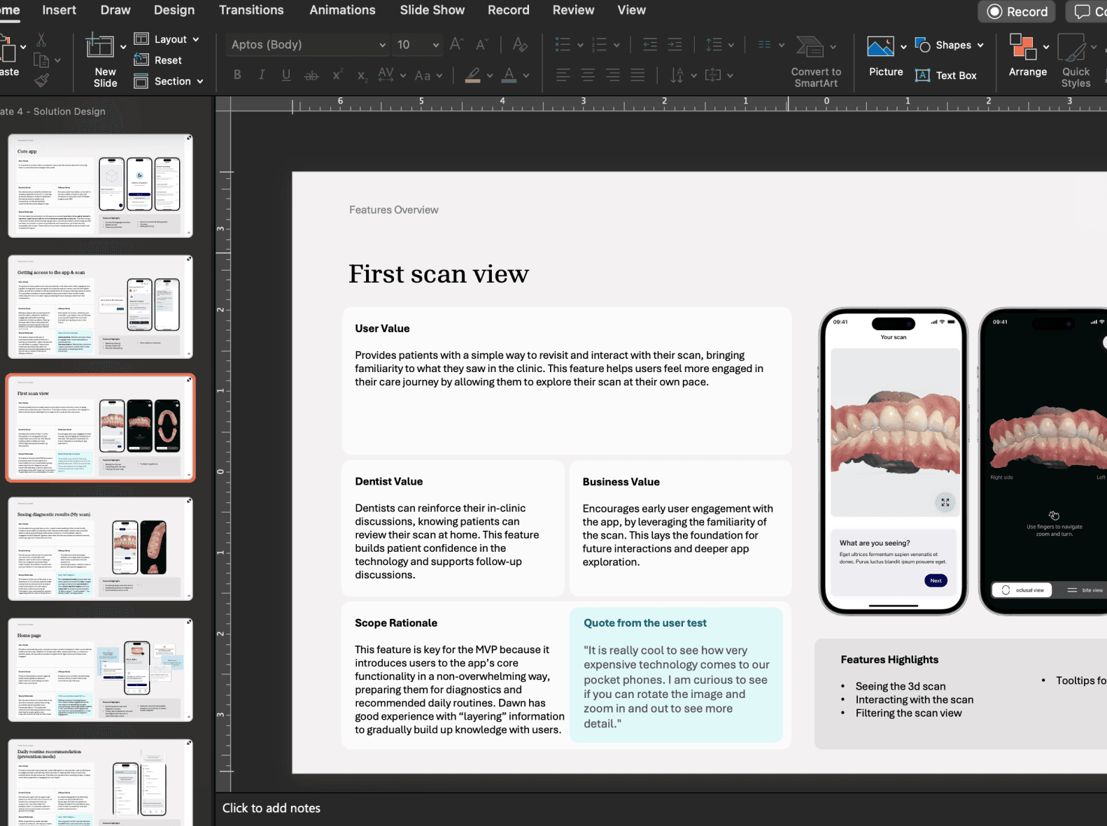 Result: A prioritized feature set with the scan visualization and personalized care plans as the core experience, diagnostic reports as a trust builder, and a deliberate decision to deprioritize reminders and goal-setting based on validation data showing fatigue risks.